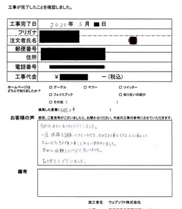 弊社にご依頼いただいた、埼玉県志木市のお客様からメッセージです。「スムーズに工事してもらい助かりました。早めに依頼しとけばと思いました。」とお声をいただきました。
